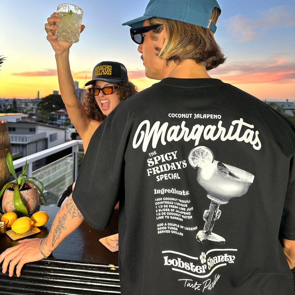 Oversized Black TeeHeavy Weight 220-GSM100% Combed CottonWide Box Fit, Slightly Shorter Lengthwith Dropped Shoulders.Hand Silk Screened on the Sunny Gold CoastFeaturing Margarita & Taste ParadiseHibiscus Flower logo's