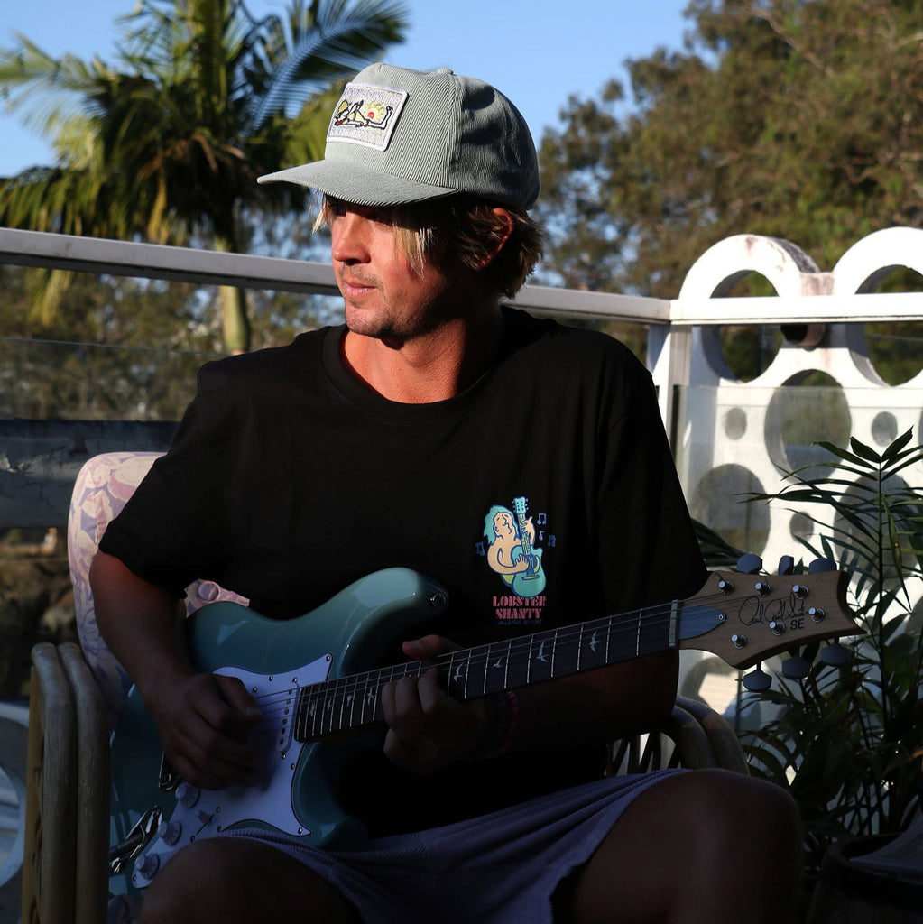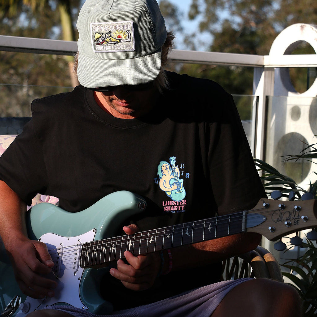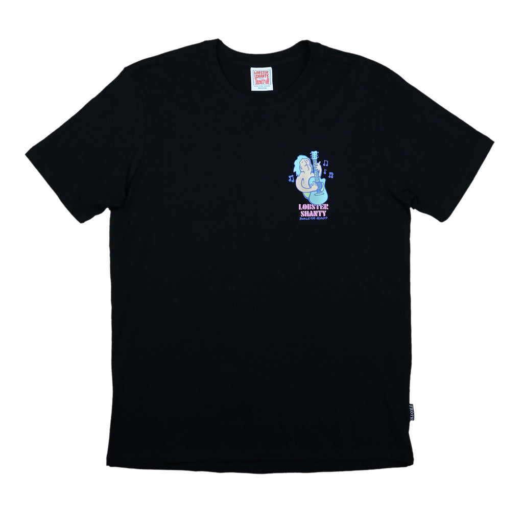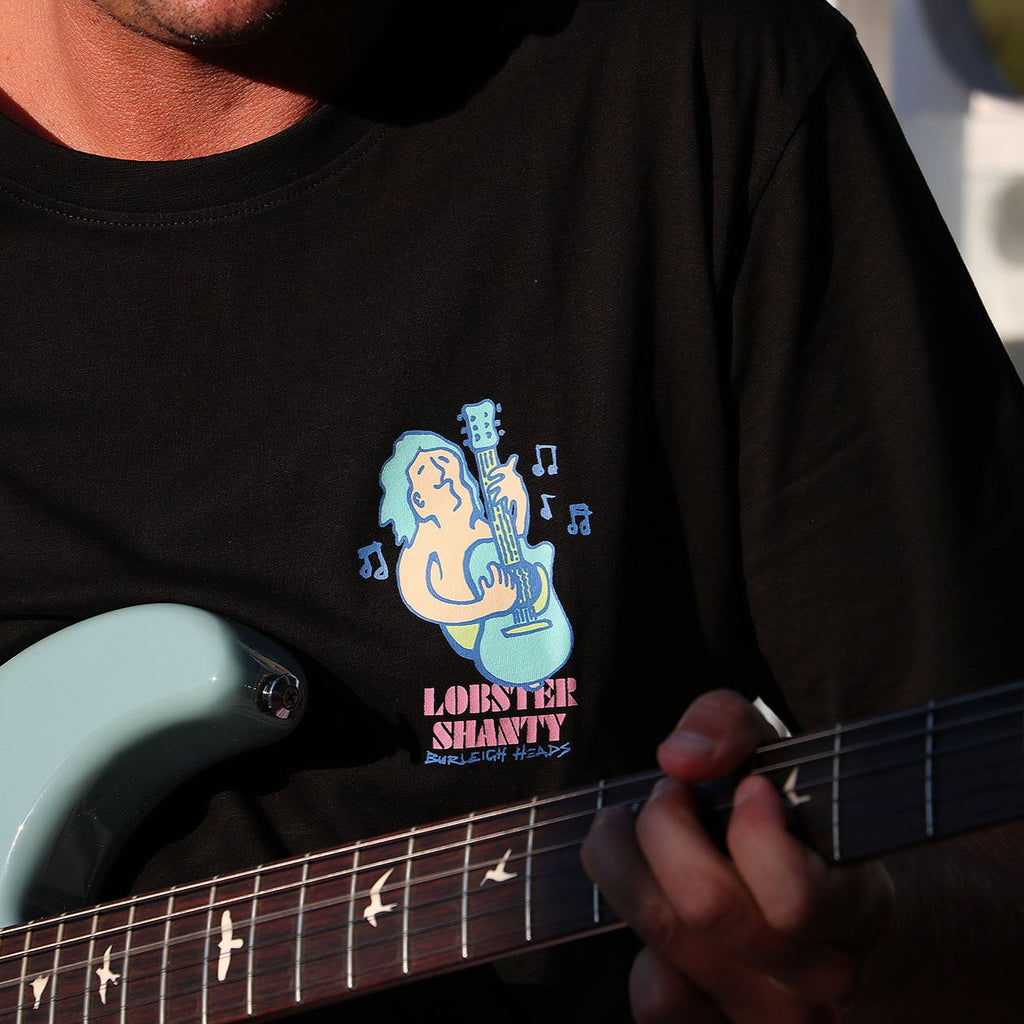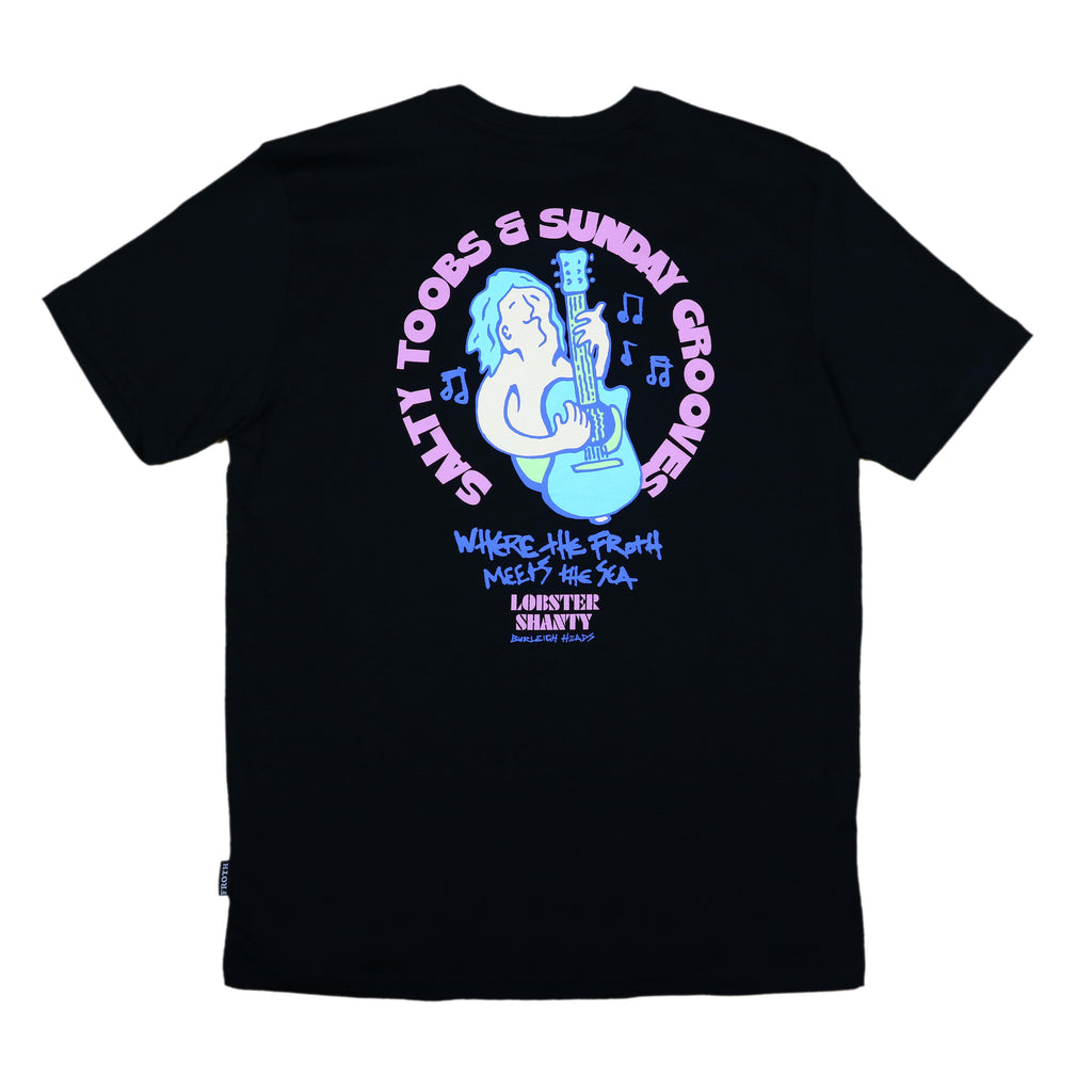 Black Tee100% Organic CottonRegular Fit - 180 GSMSilk Screened DecalFeaturing retro 80's style Salty Toobs Surf Guitar dude
