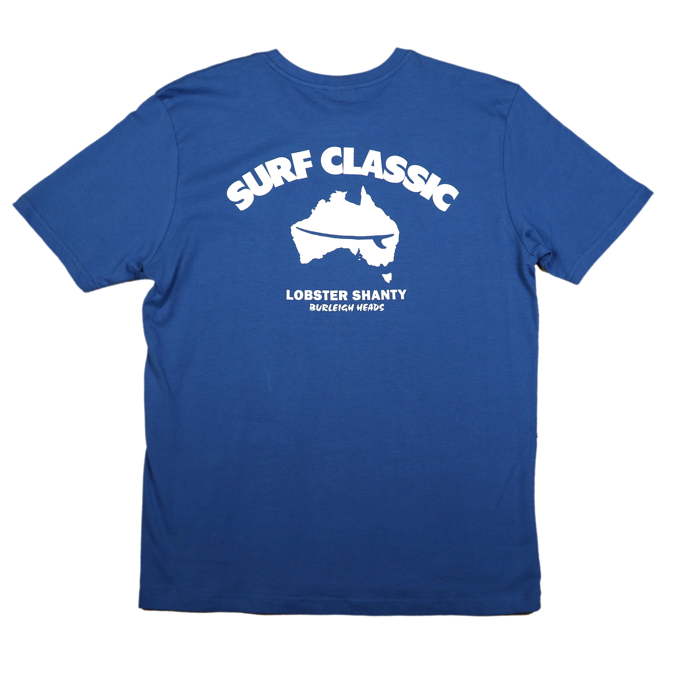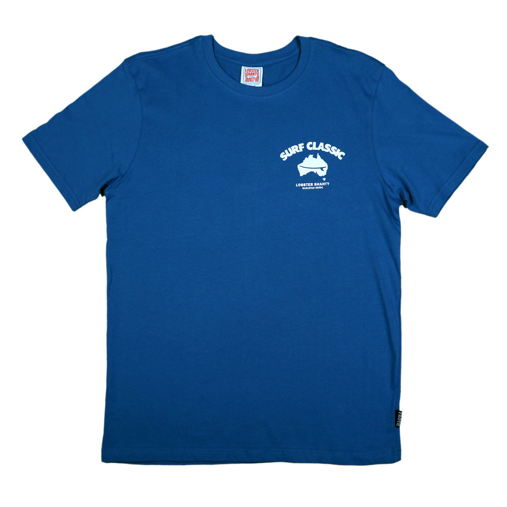 Blue Tee100% Organic CottonRegular Fit - 180 GSMSilk Screened DecalFeaturing Aussie Surf Map logoBurleigh Heads